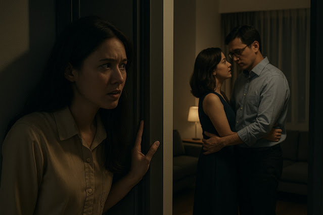 Tôi đứng chết lặng ở hành lang. Đèn trong phòng bật sáng. Tôi thấy bóng hai người, rất gần… và không chỉ là gần về khoảng cách.