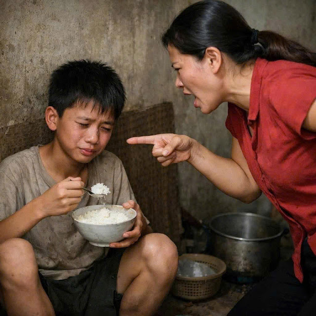 Màn hình hiện rõ: con trai tôi ngồi ở một góc bàn, trước mặt chỉ có bát cơm trắng chan nước mắm. Trong khi đó, vợ mới và con gái riêng của cô ta thoải mái gắp từng miếng tôm hùm, cua biển, thịt cá ê hề. Con trai tôi lặng lẽ cúi đầu, nhai từng hạt cơm khô khốc, đôi vai gầy khẽ run.