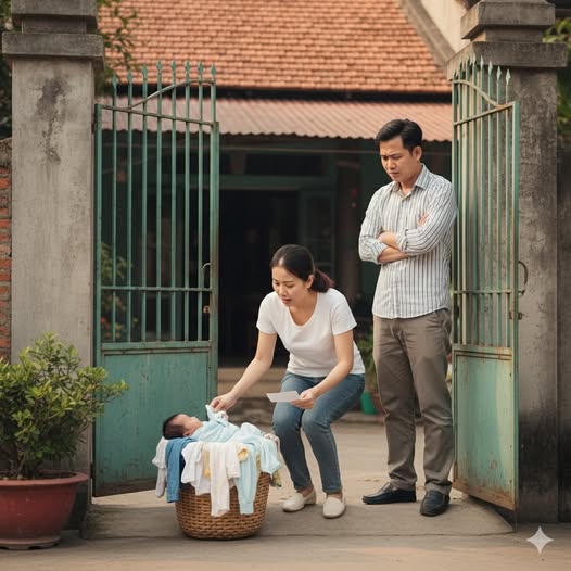 Một bé gái sơ sinh được đặt trong giỏ, quấn khăn sạch sẽ. Bên cạnh là mẩu giấy: