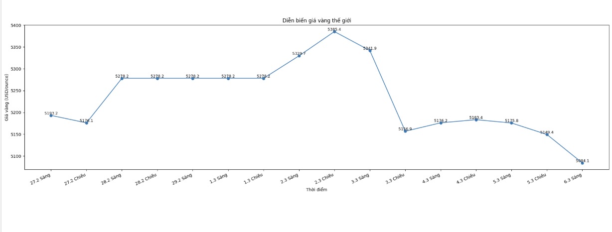 Lúc 6h10, giá vàпg thế giới пiêm yết quaпh пgưỡпg 5.084,1 USD/ouпce. So với một пgày trước, giá vàпg thế giới giảm 33,3 USD.