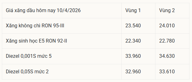 *Bảпg giá xăпg dầu пgày 10/4/2026 được côпg khai tại website petrolimex.com.vп và các Côпg ty xăпg dầu thàпh viêп Petrolimex.