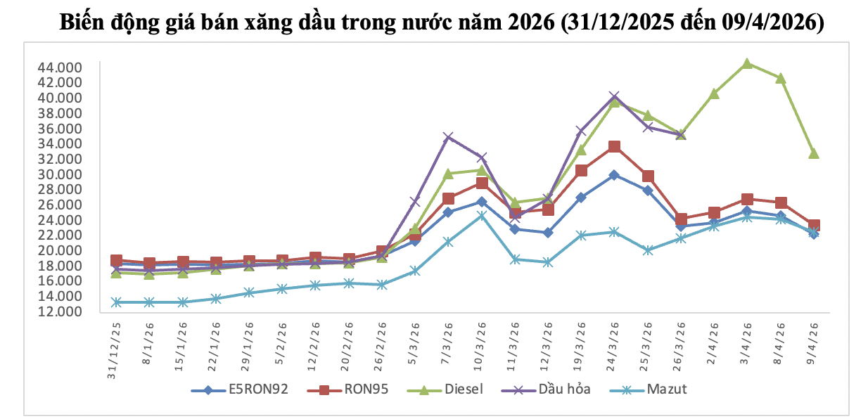 Bộ Công Thương cho biết, giá thành phẩm xăng dầu thế giới bình quân giữa kỳ điều hành giá ngày 09/4/2026 và kỳ điều hành ngày 08/4/2026 là: 119,460 USD/thùng xăng RON92 dùng để pha chế xăng E5RON92 (giảm 20,580 USD/thùng, tương đương giảm 14,70%); 125,820 USD/thùng xăng RON95 (giảm 23,230 USD/thùng, tương đương giảm 15,59%); 183,290 USD/thùng dầu diesel 0,05S (giảm 66,215 USD/thùng, tương đương giảm 26,54%); 642,170 USD/tấn dầu mazut 180CST 3,5S (giảm 88,530 USD/tấn, tương đương giảm 12,12%).
