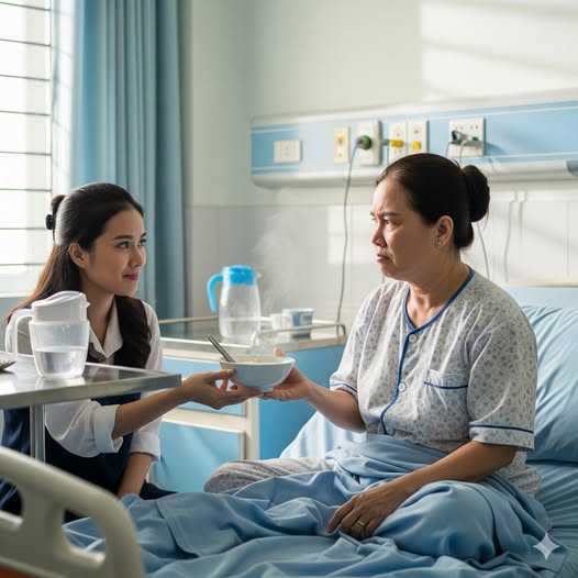 Phòng bệnh số 305 vắng tanh, chỉ có mẹ chồng ngồi dựa lưng trên giường, đôi mắt sắc lạnh. Tôi đặt làn cháo xuống bàn, cẩn thận múc ra bát, hơi nóng bốc lên thơm lừng. “Mẹ ơi, con nấu cháo gà, mẹ ăn thử chút cho nóng nhé,” tôi nói, giọng nhẹ nhàng, đưa bát cháo tới.