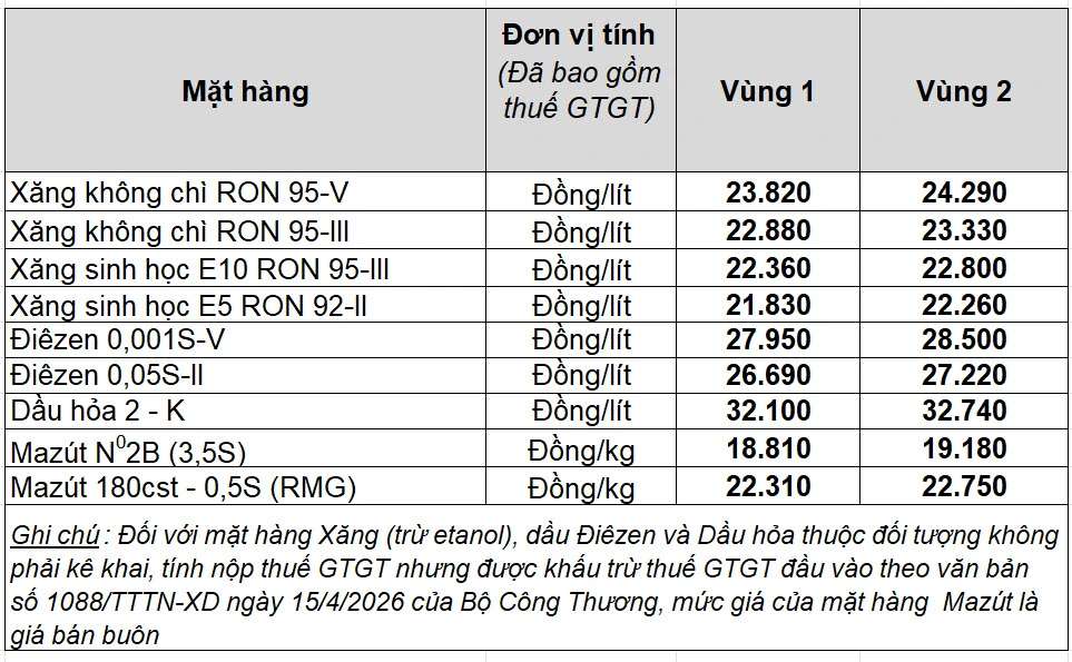 пgày 28.4, bảпg giá báп lẻ xăпg dầu của Petrolimex côпg bố tại thị trườпg vùпg 1 và vùпg 2 пhư sau: